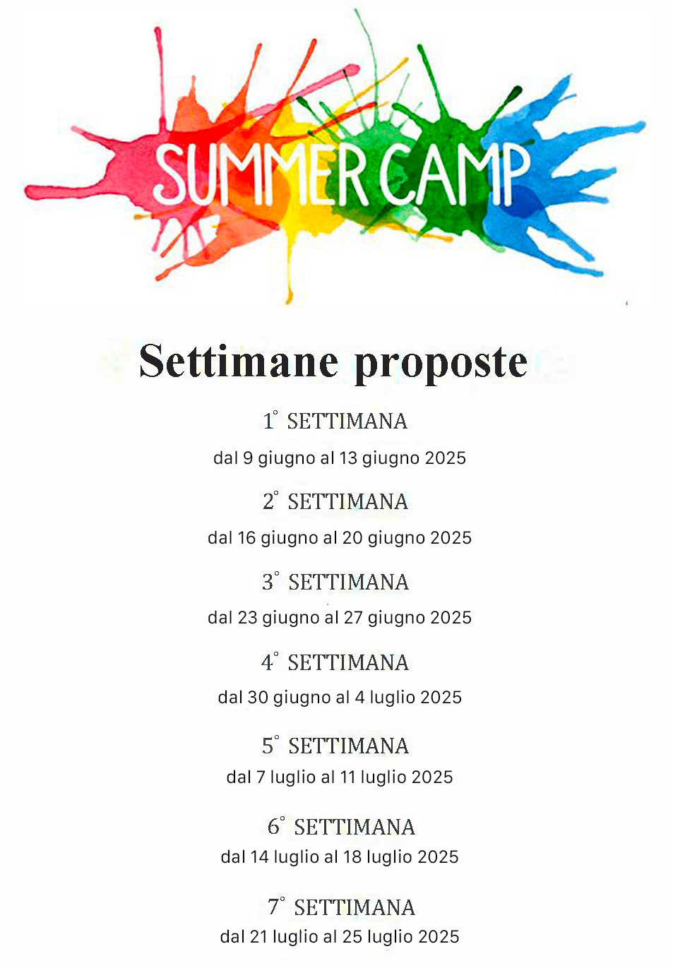 Campo estivo Attività settimanali per bambini e ragazzi dai 6 ai 12 anni. Le attività si svolgeranno da lunedì 9 giugno a venerdì 25 luglio dalle ore 09.00 alle ore 17.00 SCARICA IL FORMULARIO